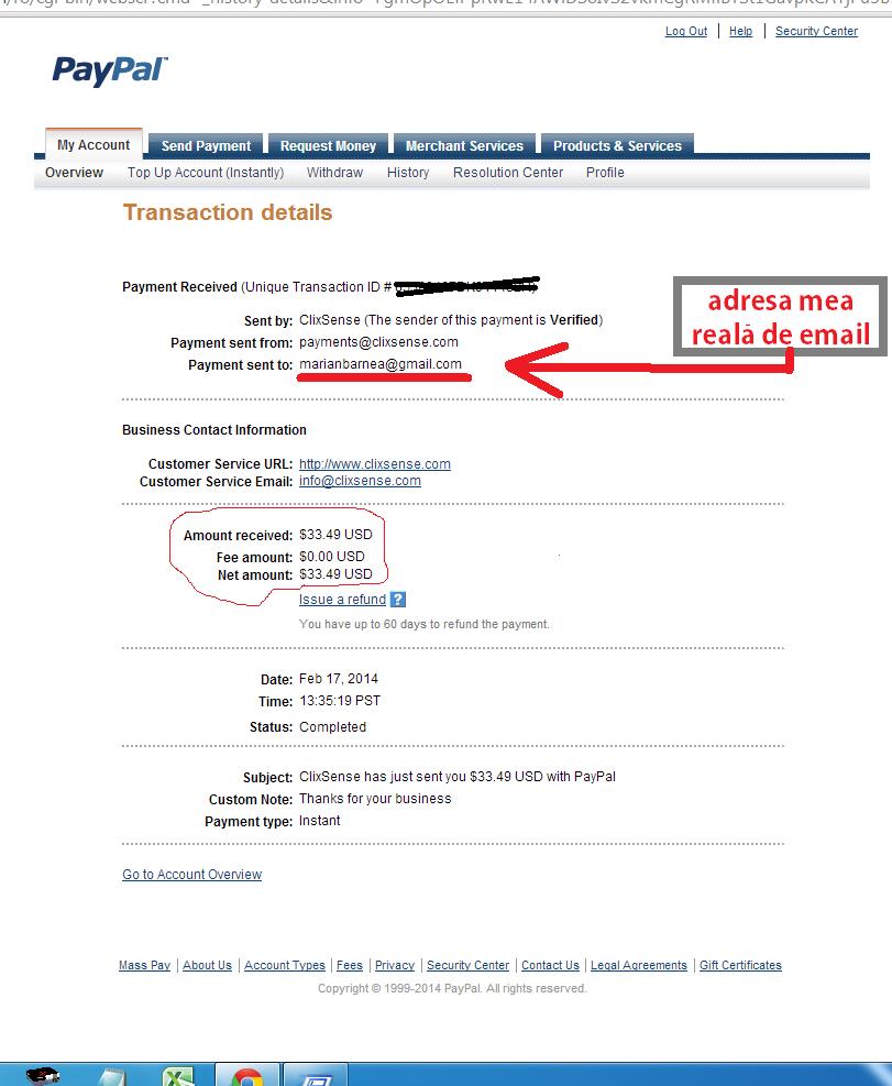 Am scos acum doua zile 33,49$, adica banii facuti in ultimele 17 zile cu Clixsense, si am considerat ca daca toti bloggerii de profil au dovezi de plata pe blogurile lor, sa o postez si eu macar pe asta(vezi imaginea de mai jos), si cand ma vor intreba prietenii pe email daca sunt platit sau daca doar visez cu ochii deschisi, le voi trimite link-ul spre articolul asta.