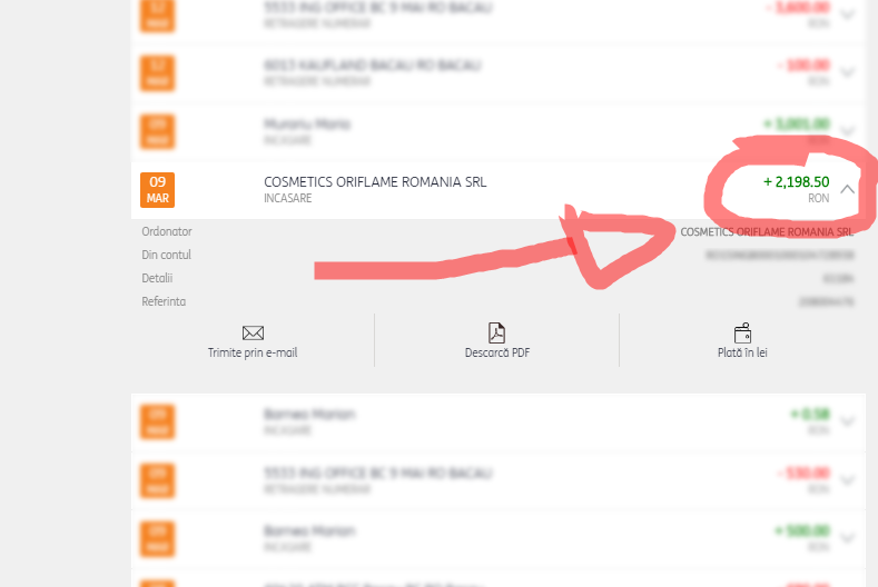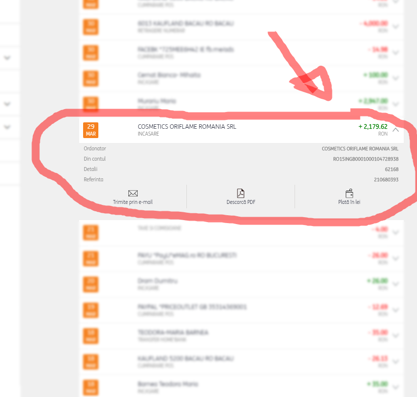 Oriflame Cosmetics Romania plateste discountul de performanță catre fiecare colaborator, din 3 in 3 saptămâni. Aici este dovada de plată din data de 9 martie 2018.