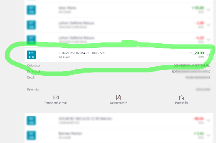 Aici vedeti o plata primita de la Profitshare. Nu sunt eu un afiliat de top, dar totusi am facturat cateva mii de lei catre Conversion Marketing.